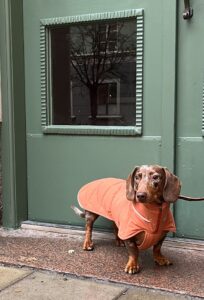 NEW IN! Denjo Dogs’s padded dog coat Wool Puffer for dachshunds is a stylish yet functional dog jacket perfect for the chilly season. This year we launch a new color of the bestselling dachshund coat- Coral. The dog coat is designed for dachshunds with their longer back, wide chest and short legs. The coat has a wool padding (75% wool) and water-repellent outer fabric. It has reflective piping along neckline and in the back. It also has an opening for harness and protective strap along chest and stomach.