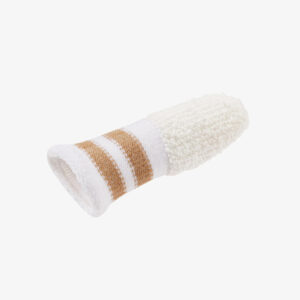 Slip your index finger into the finger cot while pulling the safety loop over your middle finger. Moisten the tip of the micro-fleece and clean all sides of each tooth with light circular movements. Thereafter, gently massage the gum and clean the tongue. After use, rinse the micro-fleece with warm water and let dry. Sterilization is possible by boiling the micro-fleece.