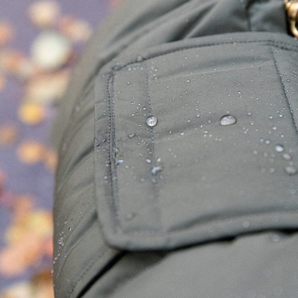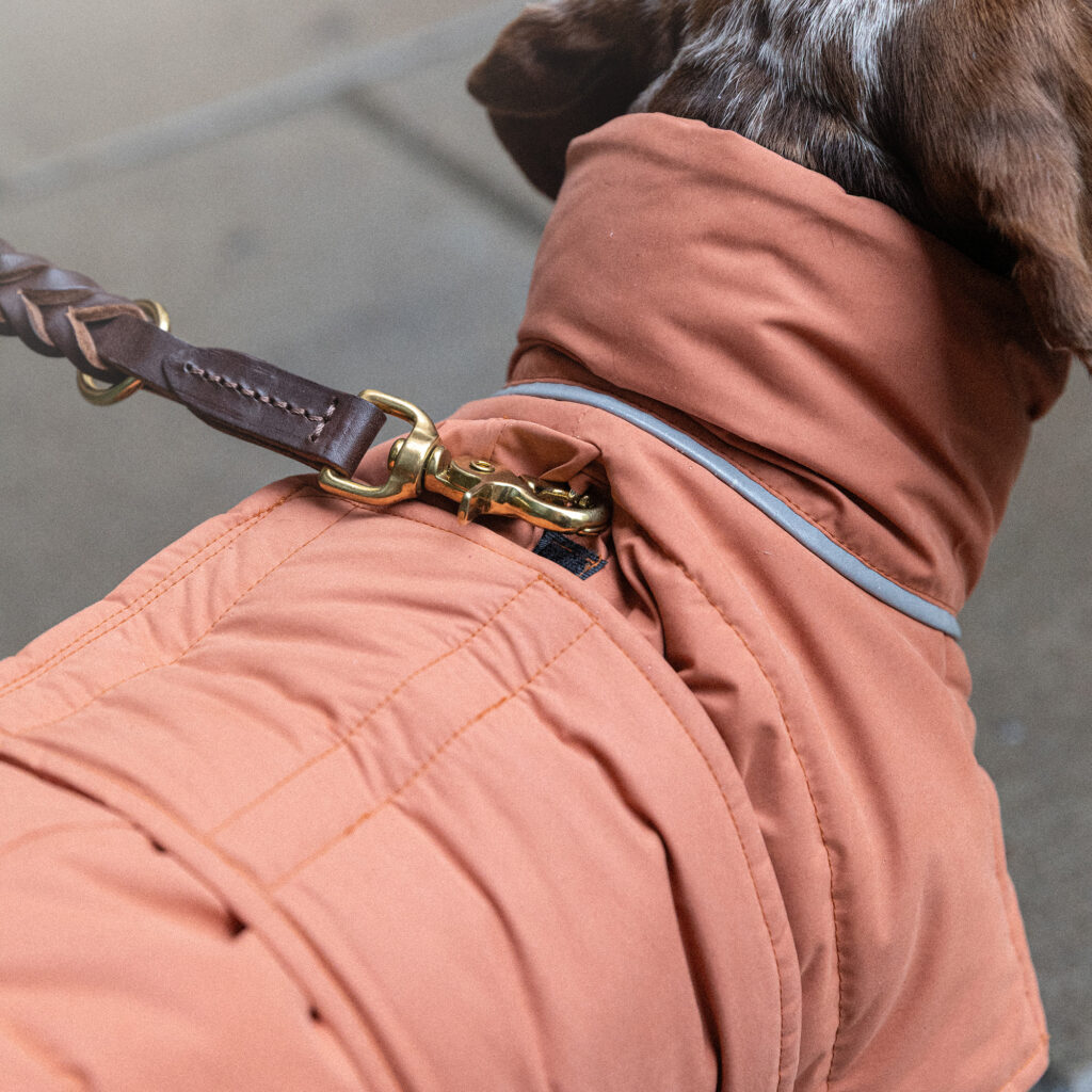 För optimal synlighet i det mörka höst- och vintervädret har jackan utrustats med reflexpiping längs hals och bakdel samt en reflexlogotyp där bak. Även en dold öppning för sele/halsband finns på ryggen för optimal funktionalitet. Remmen runt magen spänns med kardborreband och kan därmed anpassas exakt efter varje individs bröstomkrets.